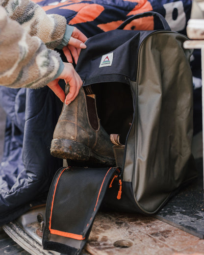 Meet the Bootdocker Boot Bag, crafted for meaningful escapism. With its durable 600D recycled polyester and smart design features like a front zipped opening and internal mesh, it's perfect for keeping your boots aired and ready for your next adventure.