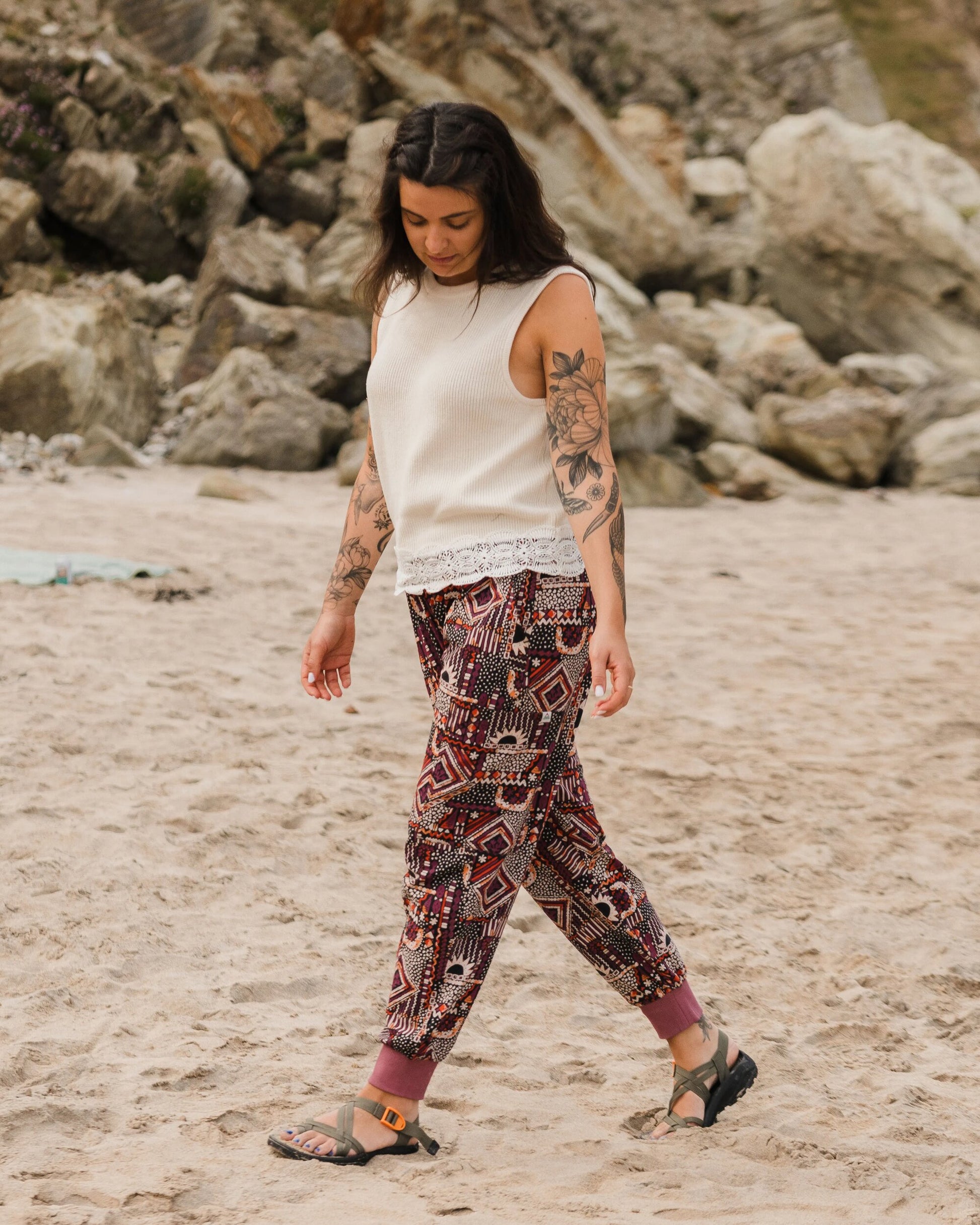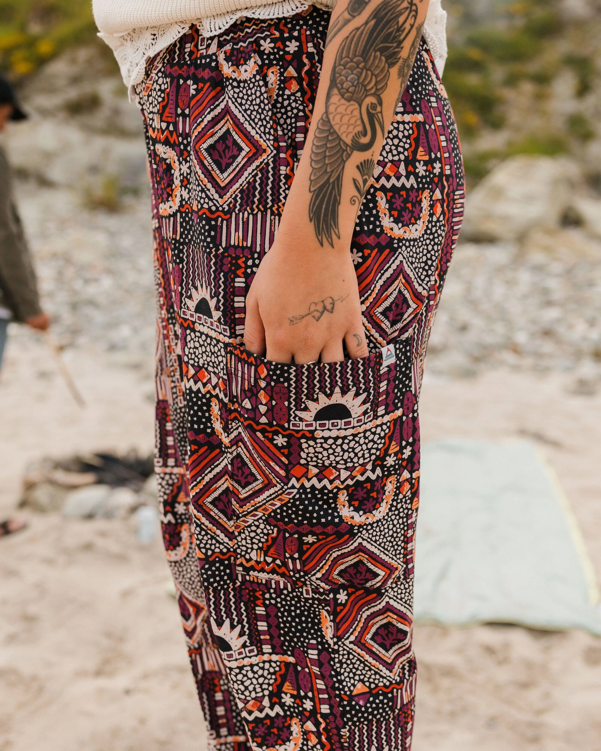 The Day Dream Printed Trouser offers ultimate comfort with a wide elasticated waistband, front and side pockets, and a relaxed fit. Perfect for any adventure.